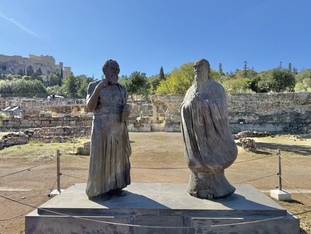 交流活动结束后的第二天,背包记者团一行前往雅典古市集遗址走访参观王瑾参赞在交流活动中提到的,作为2021年“中国——希腊文化和旅游年”开幕式重要环节之一的雕塑《神遇——孔子与苏格拉底的对话》。作品以两位思想家的会面象征中希两国文明的交融与对话,体现了中希双方从官方文化项目到民间艺术实践的多层次交流,为背包记者团接下来几天的田野调研带来了更多感悟与启发。