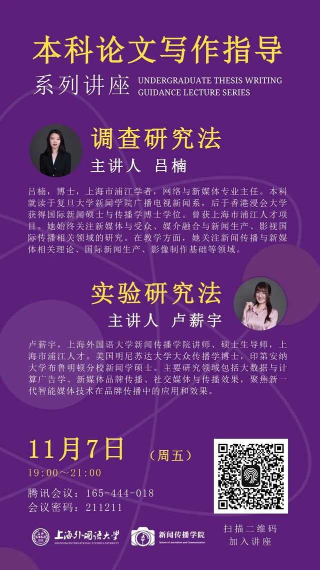 讲座内容:讲座将介绍问卷调查法的运用,介绍问卷法的优缺点、问题设计的建议与规范,并介绍实验研究法的主要流程和注意事项。
