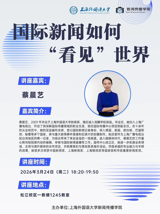 蔡晨艺,2009年毕业于上海外国语大学新闻系,随后进入高翻学院深造。毕业后,她加入上海广播电视台,开启了其深耕国际传播领域的职业生涯,现任国际传播中心项目部副主任。在十余年的从业经历中,她的足迹遍布全球,曾以国际新闻记者身份,深入德国、美国、新加坡、巴基斯坦、秘鲁等多个国家,参与重大新闻事件报道和纪录片的拍摄制作。她还曾作为上海广播电视台驻台湾地区的唯一记者,为观众带来了来自宝岛的一线报道。进入融媒体时代,蔡晨艺的工作重心转向短视频内容的编辑、审核与国际新闻直播等工作。国传中心成立后,她进一步拓展业务领域,主导与境外媒体的合作项目,并统筹策划与落地各类海外活动。凭借卓越的专业能力与丰硕的成果,她曾多次荣获中国新闻奖、上海新闻奖、上海银鸽奖等国家级和市级重要新闻奖项。