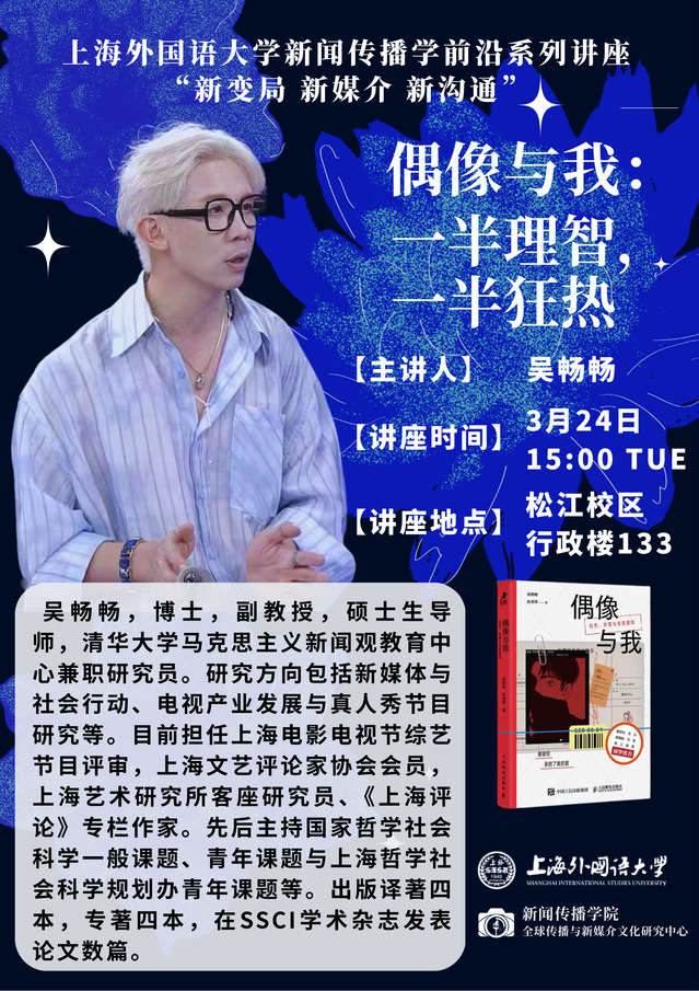 吴畅畅,博士,副教授,硕士生导师,华东师范大学传播学院新闻系,复旦大学历史系在职博士后,清华大学马克思主义新闻观教育中心兼职研究员。研究方向包括新媒体与社会行动、电视产业发展与真人秀节目研究、传播思想史等。英国伦敦国王学院、加拿大西蒙菲莎大学访问学者。目前担任上海电影电视节综艺节目评审,上海文艺评论家协会会员,上海市文化广播影视管理局下属机构上海艺术研究所客座研究员、《上海评论》专栏作家。先后主持国家哲学社会科学一般课题、青年课题与上海哲学社会科学规划办青年课题等。已出版译著四本,出版专著四本,包括《偶像与我:狂热、共情与自我建构》。在《中国季刊》(the China Quarterly),International Journal of Communication等SSCI学术杂志发表论文数篇。