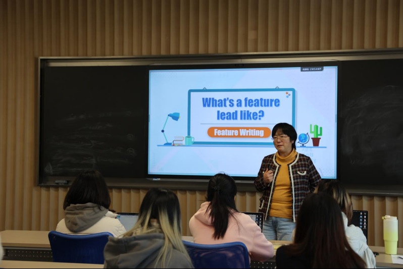 Lin Yan’s course English Feature Writing adopted an integrated teaching model combining theory, fieldwork, and output. Using classic feature stories as references, the course examined topic selection, narrative structure, and language use. A field interview project in Dongxia Village of Songjiang District formed a key practical component, helping students develop interviewing, information gathering and research skills.